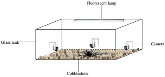 Adult female E. sinensis were collected from Baxu Wharf in Jiangyin, P.R. China (120°27′ S, 31°95′ W, salinity < 0.5, temperature 19 °C) in December. The average weight of female crabs was 102.03 ± 7.49 g, and the average shell width was 62.18 ± 11.63 mm. During a week of acclimation, female crabs were fed with fresh snail meat at the 1% of the crab weight every three days. The experimental water quality parameters were monitored daily to maintain conditions of temperature 18 ± 1 °C, dissolved oxygen > 6 mg/L, pH 7.0 ± 0.5, salinity < 0.5, total ammonia nitrogen < 0.2 mg/L and a natural light/dark photoperiod (14 L:10 D). The depth of water was kept above 15 cm. The two-thirds of water in each tank was replaced every other day and the bottom dirt cleaned daily. Then, female crabs with healthy, complete appendages and consistent specifications were selected for the behavioral experiment. The experiment device was a transparent aquarium (40 × 25 × 30 cm). A layer of sand and pebbles (diameter 2 cm) were laid at the bottom of the aquarium as shelter to facilitate crabs crawling (Figure 1). Behavioral observation was carried out in a closed laboratory, and a 20 W daylight lamp was installed above the aquarium to ensure the stability of the light source. The automatic cameras with real time monitoring were installed on the side of the aquarium for subsequent computer video analysis.