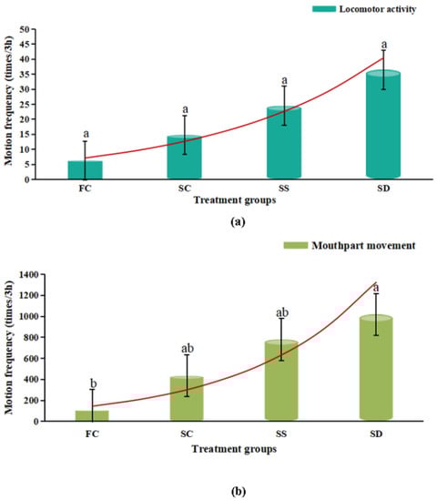 Locomotor activity (a); and mouthpart movement (b); in Eriocheir sinensis during 3 h exposure in four treatment groups (FC: freshwater control group; SC: salinity control group; SS: salinity surge group; SD: salinity dip group), and the red curve represents the exponential trend line. Bars with the same lowercase letters on the top indicate insignificant differences (p > 0.05), and bars with different letters on the top indicate significant differences (p < 0.05).