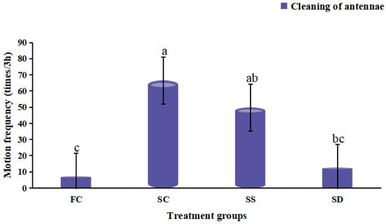 Cleaning of antennae in Eriocheir sinensis during 3 h exposure in four treatment groups (FC: freshwater control group; SC: salinity control group; SS: salinity surge group; SD: salinity dip group). Bars with the same lowercase letters on the top indicate insignificant differences (p > 0.05), and bars with different letters on the top indicate significant differences (p < 0.05).