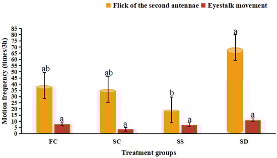 Eyestalk movement and flick of the second antennae in Eriocheir sinensis during 3 h exposure in four treatment groups (FC: freshwater control group; SC: salinity control group; SS: salinity surge group; SD: salinity dip group). Bars with the same lowercase letters on the top indicate insignificant differences (p > 0.05), and bars with different letters on the top indicate significant differences (p < 0.05).