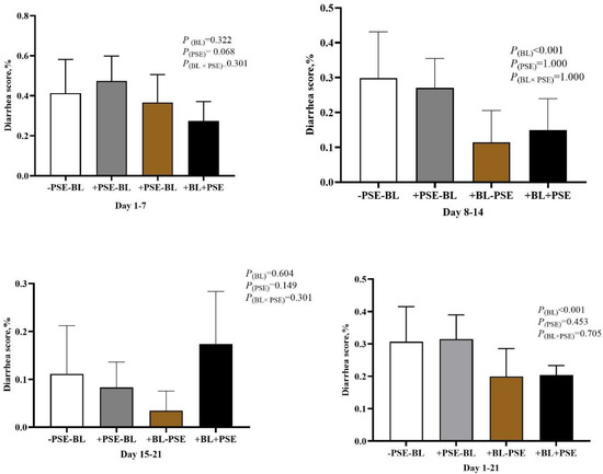 Dietary PSE tended to reduce G/F (p = 0.063) but BL tended to improve G/F during days 8–14 (p = 0.068). Dietary BL increased the G/F of piglets (p = 0.034) from days 1 to 21, as shown in Table 2, while PSE increased the G/F (p = 0.006) from days 15 to 21. However, the combined supplementation of BL and PSE showed no interactive influence on the growth performance of piglets (p > 0.10).