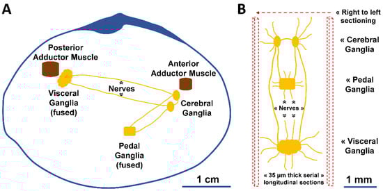 Schematic illustration of the nervous system of S. plana. (A) Longitudinal view of the right valve, depicting the right and left cerebral (cerebropleural) ganglia, pedal ganglia (fused in one), and visceral ganglia (fused in one). (B) Dorsal view of the ganglia, with inter-ganglionic connective nerves and others. The microtome serial sectioning was conducted longitudinally, from right to left.