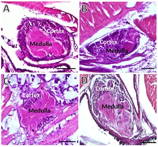 Transversely sectioned ganglia of S. plana picked randomly for illustration purposes. (A) Left cerebral ganglion. (B) Right cerebral ganglion. (C) Pedal ganglion. (D) Visceral ganglion. The outer basophilic cellular cortex contrasts with the inner medulla. Six animals per sex condition were used. H&E staining. Scale bar = 200 μm.