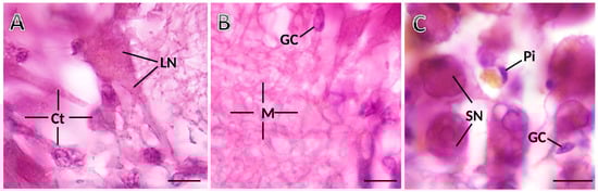 Photomicrographs taken from thick histological sections of a ganglion of S. plana. (A) Cortex (Ct), with a standing-out large neuron (LN). (B) Medulla (M), with neuronal and glial eosinophilic projections, and somata of glial cells (GC). (C) Detail of cortex, where smaller neurons (SN), one elongated glial cell (GC) and one pigment cell (Pi) are seen. Six animals per sex condition were used. H&E Staining. Scale bar: 10 μm.