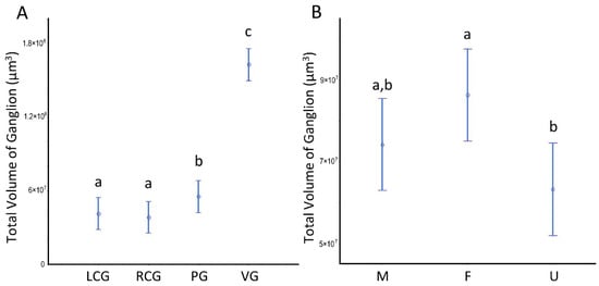 Volumes of the ganglia of S. plana. (A) Per ganglion. (B) All ganglia per sex condition. Different letters mean significant differences (p < 0.05). Data as mean and 95% confidence interval. LCG: left cerebral ganglion; RCG: right cerebral ganglion; PG: pedal ganglion; VG: visceral ganglion; M: males; F: females; U: undifferentiated. Six animals per sex condition were used.