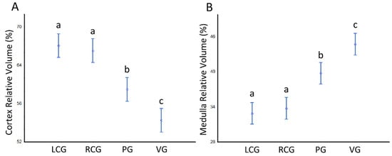 Relative volumes (%) of the cerebral, pedal and visceral ganglia cortex and medulla of S. plana, with all sex conditions combined. (A) VV (cortex, ganglion). (B) VV (medulla, ganglion). Different letters mean significant differences (p < 0.05). Data as mean and 95% confidence interval. LCG: left cerebral ganglion; RCG: right cerebral ganglion; PG: pedal ganglia; VG: visceral ganglia. Six animals per sex condition were used.