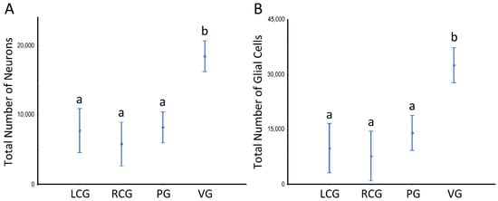 Number of neurons and glial cells in the ganglia of S. plana; data from all sex conditions combined. (A) Neurons. (B) Glial cells. Different letters mean significant differences. Data as mean and 95% confidence interval. LCG: left cerebral ganglion; RCG: right cerebral ganglion; PG: pedal ganglion; VG: visceral ganglion. Six animals per sex condition were used.