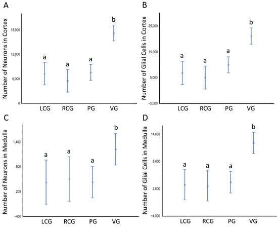 Number of neurons and glial cells in the cortex and medulla of ganglia of S. plana; data from all sex conditions combined. (A) Neurons in the cortex. (B) Glial cells in the cortex. (C) Neurons in the medulla. (D) Glial cells in the medulla. Different letters mean significant differences. Data as mean and 95% confidence interval (p < 0.05). LCG: left cerebral ganglion; RCG: right cerebral ganglion; PG: pedal ganglion; VG: visceral ganglion. Six animals per sex condition were used.
