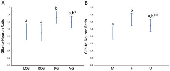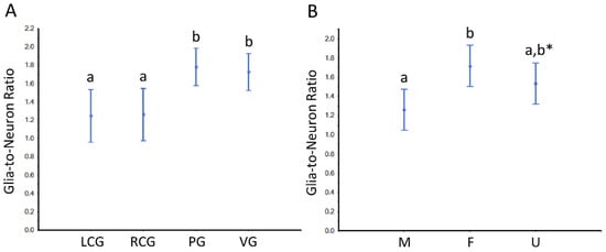 Glia-to-neuron (number) ratio in the ganglia of S. plana, considering the whole ganglia. (A) Data per ganglion type, irrespective of sex condition. (B) Results from all ganglia, grouped per sex condition. Different letters mean significant differences (p < 0.05). Data as mean and 95% confidence interval. LCG: left cerebral ganglion; RCG: right cerebral ganglion; PG: pedal ganglion; VG: visceral ganglion; M: males; F: females; U: undifferentiated. * Trend towards a significant difference between M and U (p ≈ 0.05). Six animals per sex condition were used.