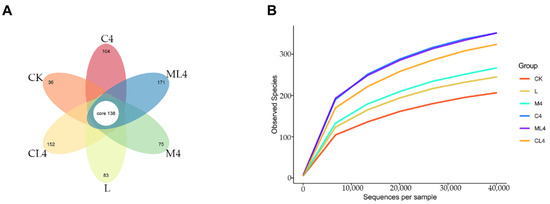The sequences were grouped in OTUs to an agreement level of 97%, and the degree of overlap of bacterial OTUs in each treatment is presented in Figure 1A. There were 1305 OTUs after 60 days of fermentation, with 138 common OTUs and 36, 83, 75, 104, 171, and 152 OTUs unique to CK, L, M4, C4, ML4, and CL4, respectively. Rarefaction curves were used to estimate species richness as a function of the sampling results. In the present study, the curves plateaued, indicating that the sequencings were saturated and that all microorganisms were identified (Figure 1B).