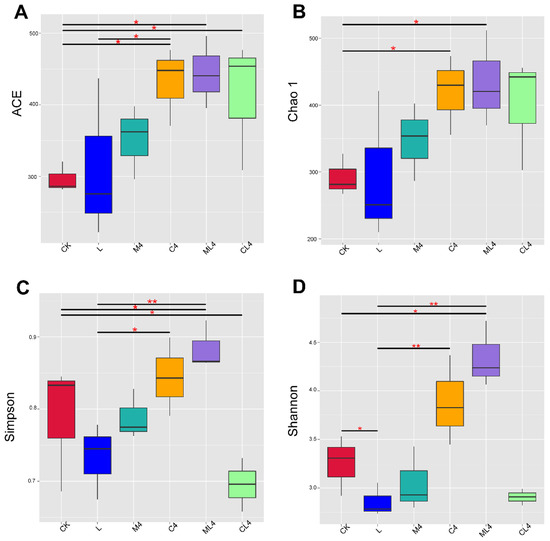 Boxplots showing the distribution of α-diversity indices among silage treatments. (A) ACE: Abundance Coverage-based Estimator; (B) Chao1 index; (C) Simpson’s index; and (D) Shannon’s diversity index. The horizontal bars in the boxes represent the median of the distance matrix distribution. The lower and upper extents of the boxes are the 25th and 75th percentiles of the distribution, respectively. The lower and upper whiskers in the box plots are the minimum and maximum values of the distribution, respectively. * p < 0.05; ** p < 0.01.
