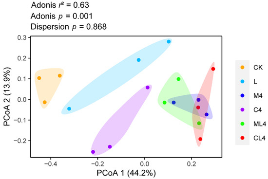 Principal Coordinates Analysis (PCoA) plot based on the Bray–Curtis dissimilarity matrix of the bacterial community among treatments. Adonis: permutational MANOVA.