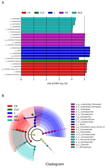 Taxonomic markers of silage C. rotundifolia under 6 treatments were separated based on linear discriminant effect size (LEfSe) analysis [linear discriminant analysis (LDA) score > 4] (Figure 4). There were 5 biomarkers in the CK silage, which showed Clostridiaceae at the family level and Clostridium at the genus level; 4 biomarkers in the L silage, with Lactobacillus at the family and genus levels; 4 biomarkers in the M4 silage, with Cyanobacteria at the phylum level and chloroplasts not defined at the genus level; 4 biomarkers in the M4 silage with Cyanobacteria at the phylum level and chloroplasts not defined at the genus level; 6 biomarkers in the ML4 silage, with Rhizobiaceae and Lachnospiraceae at the family level; one biomarker in the CL4 silage, with Lactobacillus plantarum at the species scale; and no biomarker in the C4 silage. Li et al. [43] analyzed differences in silage microbiome using the LEfSe method and found a significant correlation with silage fermentation.
