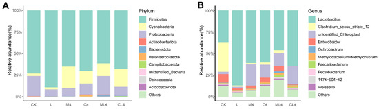 The alpha diversity of the microbial community in each silage treatment is presented in Figure 2. Chao1, an estimator of species richness based on the number of rare species, and ACE were used to estimate the number of OTUs in the community [38]. In the current study, the Shannon, Chao1, and ACE indices were lower in the L than in the CK silage, indicating that microbial diversity was reduced in the L treatment. Yang et al. [39] reported that LAB proliferated rapidly as the dominant bacteria after inoculation. In addition, a reduced pH during fermentation inhibits the activity of bacterial groups, which leads to a reduction in microbial diversity. Compared with the CK silage, the Shannon index was higher in the ML4 silage, the Chao1 and ACE indices were higher in the C4 and ML4 silages, and the ACE index was higher in the CL4 silage. This indicates that the addition of an organic acid and mixed additives could increase the bacterial community richness, which was similar to the results of Wang et al. [40]. The ACE and Chao1 indices were higher (p < 0.05) in M4, C4, ML4, and CL4 silages than in the CK silage, and the Chao1 index was higher (p < 0.05) in the C4 and ML4 silages than in the CK silage. The Shannon index was higher in the ML4 silage than the CK silage (p < 0.01) and was lower in the L silage than the C4 and ML4 silages (p < 0.05); the Simpson index was higher in the ML4 than the L silage (p < 0.05), and was higher in the ML4 (p < 0.01) and CK (p < 0.05) silages than the CL4 silage.