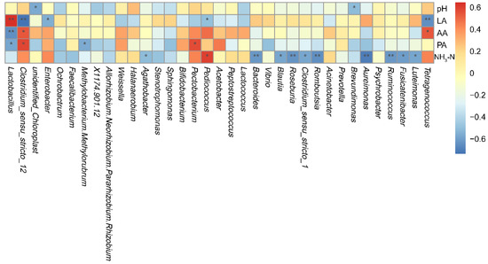 Heat map displaying the correlations between the fermentation quality of Chamaecrista rotundifolia silage and the relative abundance of bacterial genera. pH, hydrogen ion concentration; LA, lactic acid; AA, acetic acid; PA, propionic acid; NH3-N, ammonia nitrogen as a percentage of total nitrogen. * p < 0.05; ** p < 0.01.