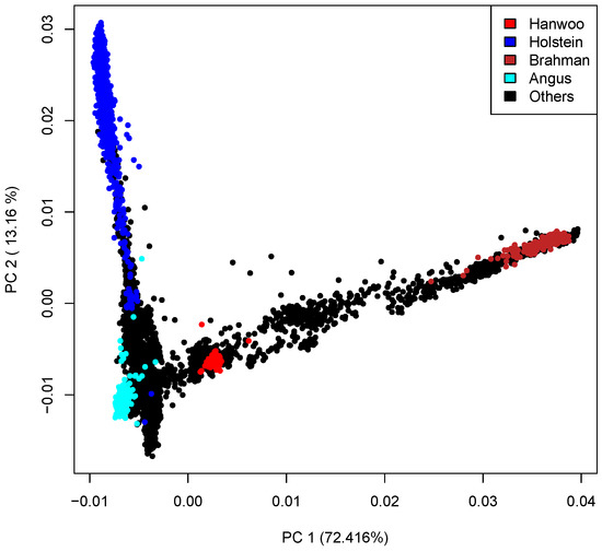 Inclusion of Hanwoo samples in the imputation reference panel provided a substantial increase in the imputation accuracy, the gain in the correlation was 0.1923, and in the concordance was 6.68%. Even with a large reference population, when there were no samples of the targeted breed in the reference population, the imputation accuracies were rather low. Here, there were only 88 independent Hanwoo for the reference, but even this small number (1.38% of the total reference) already provided a substantial improvement in the accuracy. Hanwoo is an East Asian taurine breed quite distinct from other European breeds but more closely related to other Asian breeds, such as the Wagyu and Akaushi. The reference had a limited number of these breeds to assist with the imputation (e.g., only 174 Wagyu and a single Akaushi). There is still a need to increase the representation of less European-centric breeds in sequencing efforts to improve the imputation results of these breeds.