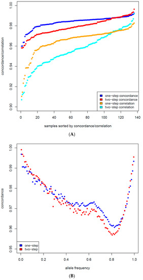 Figure 3B). We also observed that concordances were higher for variants at the two ends of allele frequency spectrum, i.e., for variants with low minor allele frequency (MAF), which is commonly observed in imputation studies [