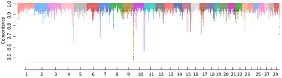Figure 3A); by SNP, correlations varied between −0.1 and 1 (18.74% of the SNPs had a correlation < 0.9, 8.8% < 0.8, and 4.5% < 0.7). The minimum, average, and maximum concordance rates were 95.99%, 98.36%, and 99.25% by animal (