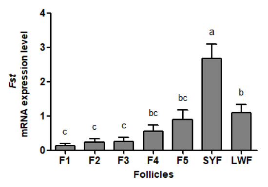 The abundance of Fst mRNA declines as follicles mature in geese (Figure 1). Fst mRNA was the most abundant in SYFs, which was significantly higher than that in other follicles. The abundance of Fst mRNA in LWFs did not differ from amounts in F4 and F5 but differed from those in F1 to F3 (p < 0.05). No significant differences were observed among F1 to F5.