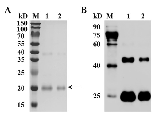 SDS-PAGE (A) and Western blot (B) analysis of recombinant goose FST protein. SDS-PAGE gel was stained with Coomassie blue. Arrow indicates the target protein. After incubation with an anti-His tag primary antibody followed by an HRP-conjugated secondary antibody, immuno-reactive bands were visualized with ECL reagent. M, protein standards; 1 and 2, purified proteins.