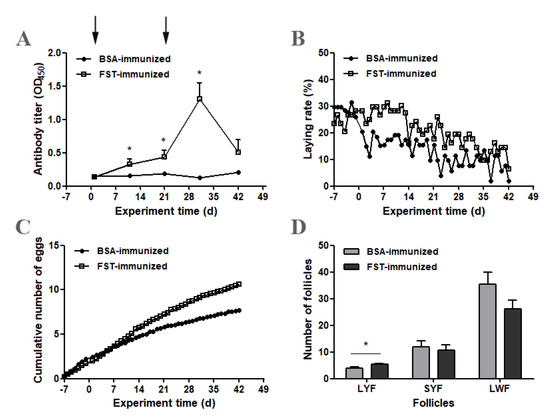 After primary immunization, the anti-FST antibody titer level increased gradually in FST-immunized geese and was higher than that in BSA-immunized control geese on day 11 (p ˂ 0.05) (Figure 3A). The anti-FST antibody titer level continued to increase in FST-immunized geese after booster immunization and reached the peak on day 31 (Figure 3A). The egg-laying rate in FST-immunized geese was higher than that in BSA-immunized control geese after primary immunization (Figure 3B). During the entire experimental period, the cumulative number of eggs laid per goose was 10.6 for the FST-immunized group, whereas it was 7.7 for the BSA-immunized group (Figure 3C). On day 42 of the experiment, the ovarian follicles of both groups of geese were collected and classified (Figure 3D). Compared with those in BSA-immunized control geese, the number of LYFs was significantly higher in FST-immunized geese. No significant differences were observed in the number of SYFs and LWFs.