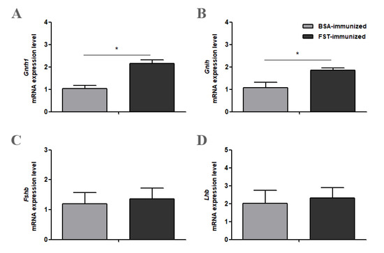Compared with those in BSA-immunized control geese, both Gnrh1 and Gnih mRNA levels from the hypothalamus tissue were significantly higher in FST-immunized geese (Figure 4A,B). In the pituitary gland tissue, both Fshb and Lhb mRNA levels in FST-immunized geese were not significantly different from those in BSA-immunized control geese (Figure 4C,D).