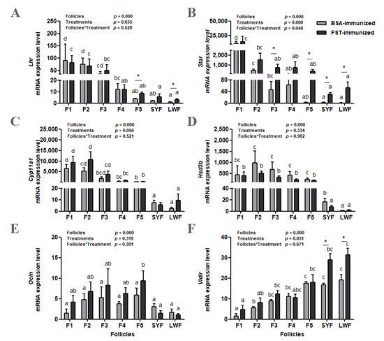 Lhr (A), Star (B), Cyp11a1 (C), Hsd3b (D), Ocln (E), and Vldlr (F) mRNA levels in granulosa layers from ovarian pre-hierarchical follicles (SYFs and LWFs) and pre-ovulatory follicles (F1 to F5) in FST-immunized or BSA-immunized control geese (n = 6). For each group, a,b,c,d represents a significant difference among the means (p < 0.05). * represents a significant difference between the two groups in one type of follicle (p < 0.05). Data represent mean ± SEM.