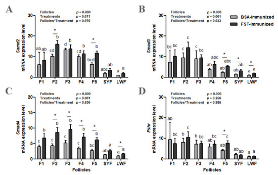 Smad2 (A), Smad3 (B), Smad4 (C), and Fshr (D) mRNA levels in granulosa layers from ovarian pre-hierarchical follicles (SYFs and LWFs) and pre-ovulatory follicles (F1 to F5) in FST-immunized or BSA-immunized control geese (n = 6). For each group, a, b, c represents a significant difference among the means (p < 0.05). * represents a significant difference between the two groups (p < 0.05) in one type of follicle. Data represent mean ± SEM.