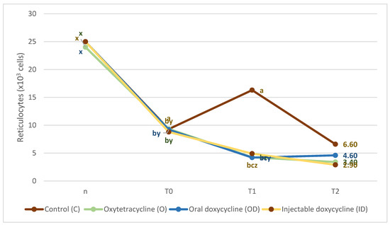 Median (25th and 75th percentile values) reticulocytes (K/µL) of lambs that were treated with oral doxycycline (OD). injectable doxycycline (ID). oxytetracycline (O), and untreated animals belonging to the control group (C) in the three moments that were analyzed: before treatment (T0). 12 days after treatment (T1), and 45 days after treatment (T2). Reticulocyte threshold values are between 0.0 and 15.0 K/µL. abc indicate significant differences (p < 0.005) between treatments at the same sampling time, and xyz indicate significant differences (p < 0.005) between the different sampling times within the same treatment.