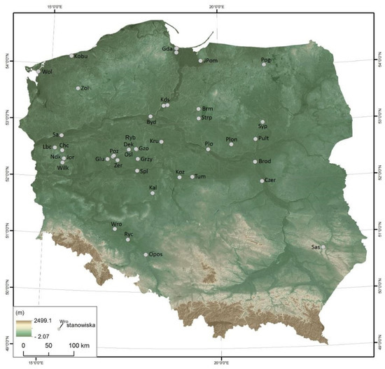 Figure 2. Sites with finds of horse skulls (the acronym of the site is given first, the number or name of the site in the following place, the number of skulls in brackets): Bis—Biskupin 15a—spring (2); Brm—Brodnica-Michałowo, 1 (1); Brod—Bródno Stare (3); Byd—Bydgoszcz, stan. 1; (1); Chc—Chycina, 19; (3); Czer—Czersk (1); Dek—Dziekanowice, 22 (2); Gda—Gdańsk, 1 (7), Gdańsk, 2 (2), Gdańsk, ul. Grodzka (5); Głu—Głuchowo, 1 (7); Gzo—Gniezno, 15 (1), Gniezno, 15d (3); Gniezno, 76 (2); Grzy—Grzybowo, 1 (1); Jpom—Janów Pomorski, 1 (1); Kal—Kalisz-Zawodzie (5); Kds—Kałdus, 2 (5), Kałdus, 3 (4), Kałdus, 4 (2); Kobu—Kołobrzeg-Budzistowo 1 (5); Koz—Kozanki Podleśne 1 (3); Kru—Kruszwica, 2; (1), Kruszwica, 4 (1), Lbc—Lubniewice, 9; (3); Ndk—Nowy Dworek, 27 (1); Opos—Opole-Ostrówek, 1 (4); Osl—Ostrów Lednicki–Rybitwy, 3a (6), Ostrów Lednicki, 2 (6); Plo—Płock, (1); Plon—Płońsk 7 (4); Pog—Poganowo, 4 (11); Polt—Półtusk (1); Poz—Poznań, ul. Wodna 13 (2); Pow—Poznań-Wilda 164 (2); Ryb, 3 (1); Ryc—Ryczyn, 1 (3); Sa—Santok, 1 (1); Sas—Sąsiadka (1); Spl—Spławie, 2 (1); Strp—Starorypin, 1B (1); Syp—Sypniewo (1); Tum—Tum k. Łęczycy, 1 (9); Wilk—Wilkowo, 1 (1); Wol—Wolin-miasto, 1/4 (1),Wolin-miasto, 1/5 (8), Wolin—Srebrne Wzgórze, 5/II (1), Wolin, 3 (8); Wro—Wrocław–Ostrów Tumski 1 (8); Zer—Żerniki, 34 (6); Zol Żółte, 33 (4) (prepared by D. Makowiecki, drawing M. Skrzatek).