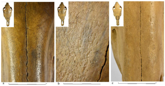 Figure 4. Two horse skulls of males from the Gdańsk stronghold (Grodzka street, site 1). (a,b) scratches on the bone surface; (c) no scratches on the bone surface. (a,b) scratches on the bone surface; (c) no scratches on the bone surface (photo by M. Gembicki).