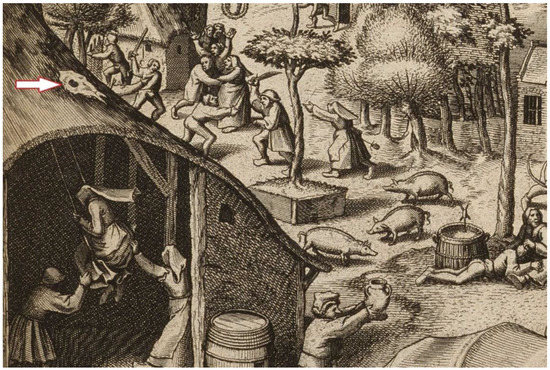 Figure 5. Skull of a horse on the roof of the building. St. George’s Day, painting by P. Bruegel (the part of the painting by https://upload.wikimedia.org/wikipedia/commons/3/31/Pieter_Bruegel_the_Elder_-_The_Fair_of_Saint_George%27s_Day_-_Google_Art_Project.jpg, accessed date on 5 April 2022).