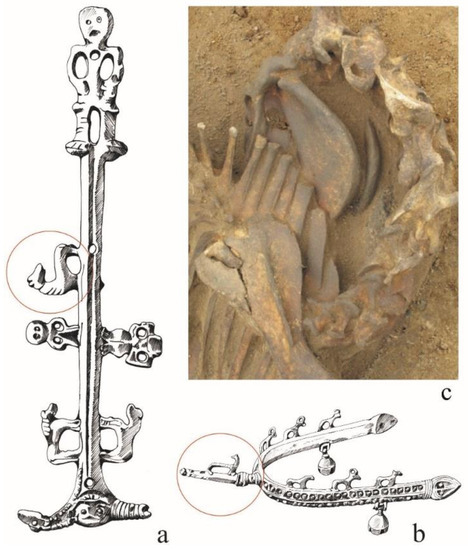 Figure 7. Cases of an unnatural position of the horse’s neck—discussed in the text: (a) the Oldenburg knife scabbard ferrule according to Kaczmarek [116]; (b) Spur from Ciepłe, according to Gardeła et al. [111]; (c) horse burial from Pień, according to Makowiecki and Janeczek [96] (Figure prepared by J. Sawicka and P. Szczepanik).