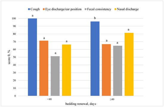 Effect of frequency of bedding renewal on calf health scores. Score 0 corresponds to normal condition. Different letters between bars of the same colour mean p < 0.05.