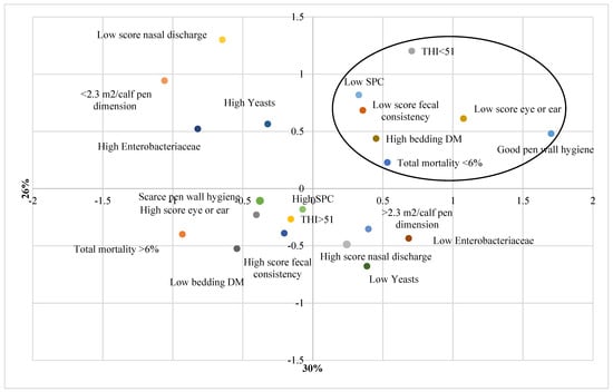 One dimension explains 30.0% of the total variation while the second dimension explains 26%. From MCA emerged that, in conditions of high bedding dry matter (dry bedding), both scores for faecal consistency and eye discharge/ear position were low and total calf mortality lower than 6%. These conditions were related to good air quality (low SPC) and low THI (below the average value recorded).