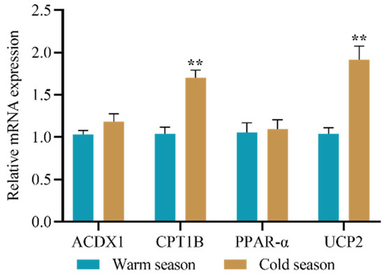 As shown in Figure 1, compared to that in the warm season, the mRNA expression of the thermogenesis-related gene UCP2 and the fatty acid oxidation-related gene CPT1B in the liver was markedly enhanced in the cold season (p < 0.01, both). There were no significant differences in the expression of ACDX1 and PPAR-α between the cold and warm seasons (p > 0.05).