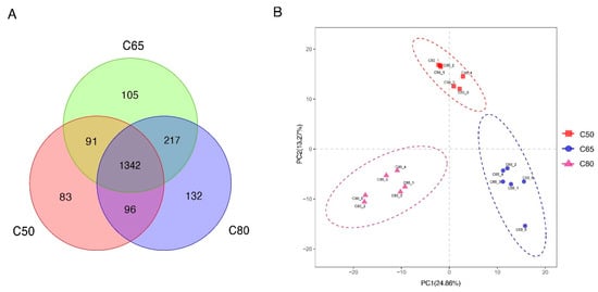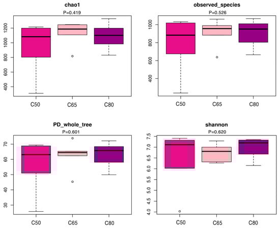 A total of 1,612,611 effective 16S rDNA gene sequences were obtained from eighteen yak fecal samples. After subsampling each sample to an equal sequencing depth and clustering, we obtained 2066 OTUs with a recognition rate of 97%. The 1342 OTUs were shared, accounting for 64.96% of the total number of OTUs. The number of OTUs in the C50, C65, and C80 groups were 1612, 1755, and 1787, respectively, with corresponding numbers of unique OTUs of 83, 105, and 132, respectively (Figure 1A). The unweighted PCoA analysis based on UniFrac showed that the contribution of the first and second principal components was 24.86% and 13.27%, respectively, and the bacterial structure of the fecal of each treatment group of yaks could be clearly separated (Figure 1B). The study showed that the structure of fecal colony structure was significantly different between diets with different concentrate-to-forage ratios, indicating that feeding different diets with different concentrate-to-forage ratios influenced the composition of fecal colony structure in yaks. The Chao 1 index measured the richness of the flora, the Shannon index and the coverage index of the PD-whole-tree measured the diversity of the flora, and Observed-species was used to analyze the number of OUTs, with higher indices indicating higher diversity and richness of the flora in the sample. By alpha diversity analysis (Figure 2), there were differences in the diversity and richness of the flora between the Chao1 value, the coverage index of PD-whole-tree, the Shannon index, and Observed-species.