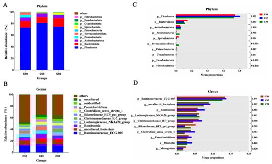 At the phylum level (Figure 3C), the relative abundance of Firmicutes was the most abundant in the C65 group, the lowest in the C50 group, the highest relative abundance of Bacteroidetes in the C80 group, and the lowest relative abundance in the C65 group, but the difference was not significant (p > 0.05). The relative abundance of Verrucomicrobiota was significantly higher in the C50 group than in the other two groups (p < 0.05). With the increase in dietary concentrate ratio, Firmicutes showed a trend of increasing and then decreasing, while Bacteroidetes showed a trend of decreasing and then increasing. At the genus level (Figure 3D), the relative abundances of Ruminococcaceae_UCG_005, uncultured_bacterium, Romboutsia, and Christensenellaceae_R-7 were higher in the C56 group than in the C50 and C80 group. The relative abundance of Ruminococcaceae_UCG_005, uncultured_bacterium, Romboutsia, and Christensenellaceae_R-7 all showed a trend of increasing and then decreasing with increasing the percentage of dietary concentrates. However, the relative abundance of Lachnospiraceae_NK3A20 and Rikenellaceaewas_RC9_gut lower in the C65 group, the relative abundance of Lachnospiraceae_NK3A20 was the highest in C50, and that of Rikenellaceaewas_RC9_gut was the highest in C80. Still, the difference was not significant (p > 0.05). Show that with the increase in the concentrate-to-forage ratio, the dietary concentrate-to-forage ratio decreased firstly and then increased.
