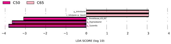We also performed LEfSe (Linear discriminant analysis Effect Size) to detect variations in the bacterial taxa composition. LDA values were greater than 3, and significant differences among the three concentrate-to-forage diets are shown in Figure 4. In addition, when microbial communities were compared in the context of different concentrate-to-forage ratio diets, the most abundant bacterial genera in the C50 group were Prevotellaceae_UCG_001, Pygmaiobacter, and Tyzzerella. At the same time, Arthrobacter and Arthrobacter_sp_Edens01 were C65 groups that were more abundant.