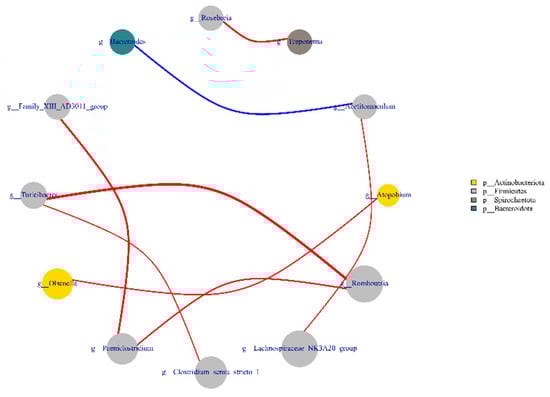 Using the Spearman test, the genus level results of the top 20 absolute abundances of all samples were selected for intercorrelation analysis (Figure 5). Roseburia was positively correlated with Treponema (r > 0.008, p < 0.01), Acetitomaculum was positively correlated with Lachnospiraceae_NK3A20 (r > 0.81, p < 0.01) and negatively correlated with Bacteroides (r < −0.70, p < 0.01), Atopobium was positively correlated with Olsenella (r > 0.76, p < 0.01), Romboutsia was positively correlated with Turicibacter and Paeniclostridiu (r > 0.67, p < 0.01), Paeniclostridium was positively correlated with Family_ XIII_AD3011 and Romboutsia were positively correlated (r > 0.69, p < 0.01), Turicibacter was positively correlated with Clostridium_sensu_stricto_1 and Romboutsia (r > 0.61, p < 0.01).