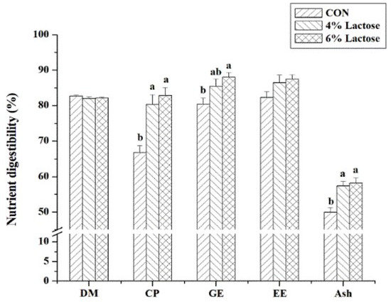 Effect of dietary lactose supplementation on nutrient digestibility in weaned piglets. Values are means ± SEs; n = 12. Values with different letters are significantly different (p < 0.05). CON, basal diet; 4% Lactose, diet supplemented with 4% lactose; 6% Lactose, diet supplemented with 6% lactose; DM = dry matter; CP = crude protein; GE = gross energy; EE = ether extract.
