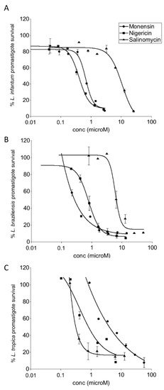 Figure 1. Dose-response curves of the effect of salinomycin, monensin, and nigericin on the growth of promastigotes of L. infantum (A), L. braziliensis (B), and L. tropica (C). Each point represents the mean ± SD from one representative experiment in duplicate out of three conducted in the same conditions.