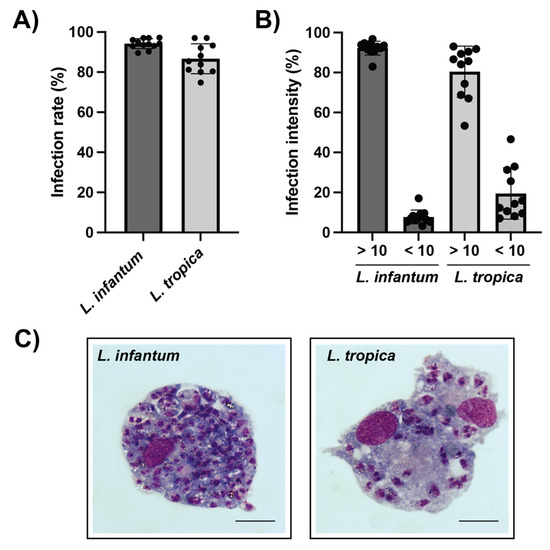 Figure 2. Leishmania spp. infection of differentiated primary canine macrophages. (A) Upon ex vivo isolation from whole peripheral blood and further differentiation with PMA, canine monocyte-derived macrophages were infected with L. infantum or L. tropica promastigotes during 72 h at a ratio of 1:10 cells:parasites. The proportion of parasite-bearing cells was quantified through Giemsa staining. (B) The intensity of the infection was evaluated by counting the number of intracellular amastigotes within infected macrophages. (C) Representative optical images of Giemsa-stained canine macrophages containing L. infantum (left) and L. tropica (right) amastigotes. Note the high number of L. infantum intracellular stages within canine cells. Scale bar 5 µm. Data (mean ± SD) from four independent experiments are shown.