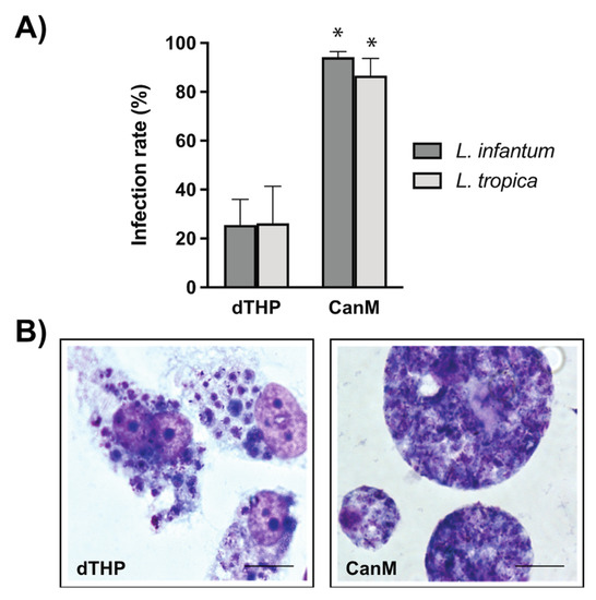Figure 3. Comparative parasite infection of human vs. canine macrophages. (A) Percentage of infected dTHP-1 or canine macrophages (CanM) with L. infantum and L. tropica promastigotes. Infected cells were Giemsa stained and the percentage of infected cells was calculated. Data are the mean of IC50 (µM) ± SD of at least four different experiments in duplicate. Significant differences were found between the infection rates of human and canine macrophages with L. infantum and L. tropica (* p < 0.05, two-way ANOVA and Sidak’s multiple comparison test). (B) Selected images of Giemsa-stained dTHP-1 and CanM containing L. infantum amastigotes.
