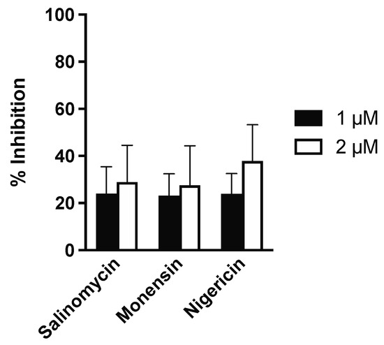 Figure 4. Antiparasitic activity of ionophores against amastigotes of L. infantum in canine macrophages. Infected cells were treated with two ionophore concentrations (1 and 2 µM) for 72 h and subsequently stained with Giemsa to calculate the proportion of infected cells. The % of inhibition in drug-treated samples was then quantified by considering the infection in untreated controls as 100%.
