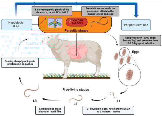 The life cycle of Haemonchus contortus in sheep. [Created with BioRender.com, accessed on 21 June 2022].