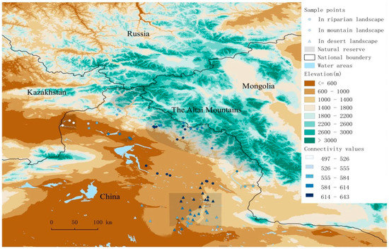 Study area and location of transect lines. Transect lines located in mountain landscape-square points; riparian landscape-circle points; desert landscape-triangular points. Connectivity values are showed as a graduated blue color from low value to high value.