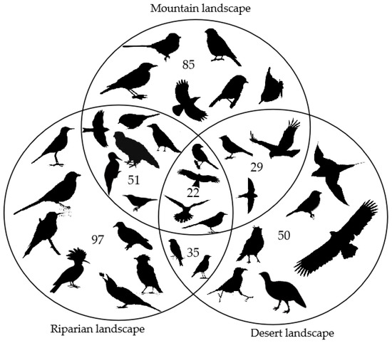 The bird species compositions varied appreciably both within and across landscapes, reflecting very substantial beta diversities. Nestedness contributed much less than turnover; it indicated that the bird species found at less diverse sites were not subsets of species at more diverse sites. The bird diversity patterns suggest that not only the mountain landscape but also the riparian and desert landscapes, which are not in the range of the Altai-Sayan ecoregion, should be considered conservation hotspot areas for birds. Moreover, larger/more protected areas are needed to totally cover species turnover.