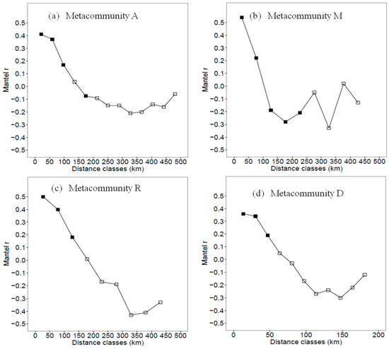Mantel correlograms for environmental predictors in (a) metacommunity A (localities in the study area), (b) metacommunity M (localities in the mountain landscape), (c) metacommunity R (localities in the riparian landscape) and (d) metacommunity D (localities in the desert landscape). Solid squares indicate that the correlations are significant at a = 0.05, and the blank squares indicate that the correlations are not significant.