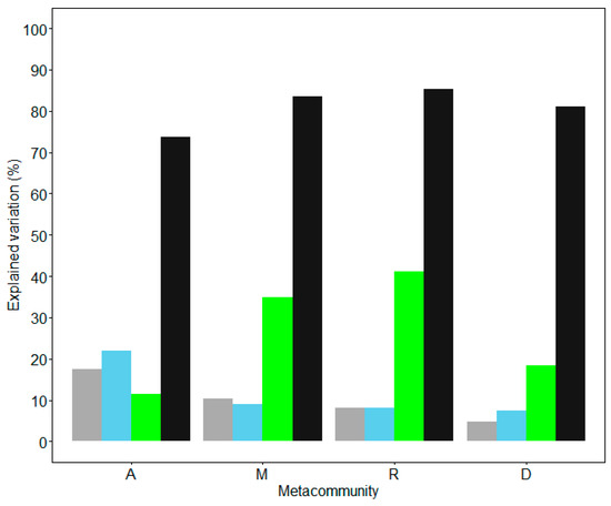 - Monteiro, V.F.; Paiva, P.C.; Peres-Neto, P.R. A quantitative framework to estimate the relative importance of environment, spatial variation and patch connectivity in driving community composition. J. Anim. Ecol. 2017, 86, 316–326. [Google Scholar] [CrossRef] [PubMed]